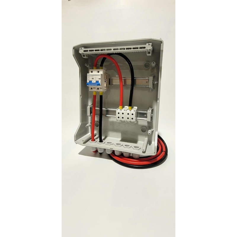 Управління для підключення двох енергетичних магазинів низьковольтних енергій, оснащених захистом постійного струму у вигляді 25а-постійного струму, двошарового перемикача, подвійних роз'ємів та проводів AWG4 для підключення інвертора.